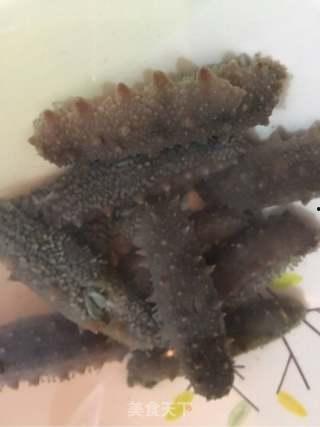 首先,将处理好的海参放入开水中焯水,去除腥味。将焯水后的海参放入碗中,加入适量的料酒、姜片和葱段,腌制10分钟。