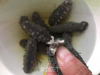 首先,将处理好的海参放入开水中焯水,去除腥味。将焯水后的海参放入碗中,加入适量的料酒、姜片和葱段,腌制10分钟。